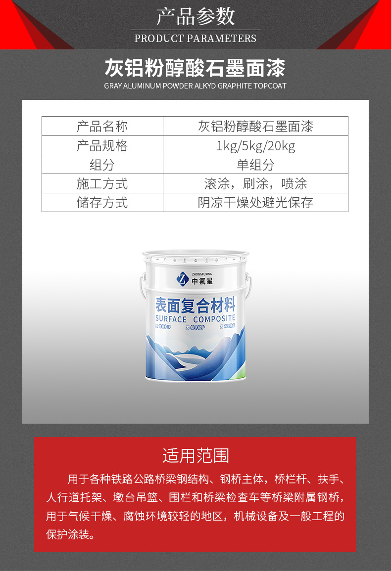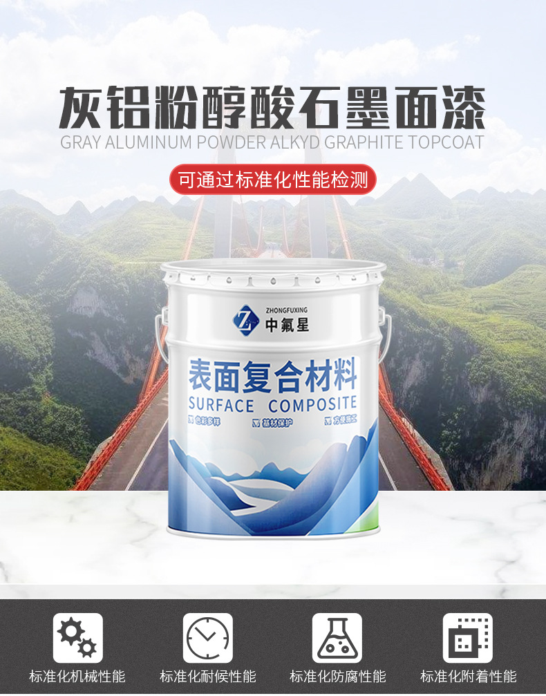 【中氟星】灰鋁粉醇酸石墨面漆由醇酸樹脂、鱗片狀的鋁粉石墨復(fù)合顏料、催干劑、多種添加劑、溶劑等配制而成,為單組分。該漆具有可通過標(biāo)準(zhǔn)化檢測(cè)的附著力、水氣滲透性、防潮性、耐候性能、抗粉化性、硬度,涂膜豐滿光亮,標(biāo)準(zhǔn)化的耐化學(xué)腐蝕性能,具有良好的光澤度和物理機(jī)械性能,可在常溫下干燥。