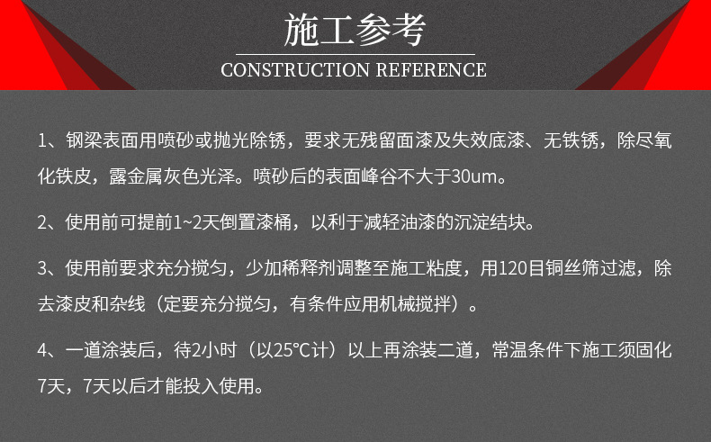 用于各種鐵路公路橋梁鋼結(jié)構(gòu)、鋼橋主體,橋欄桿、扶手、人行道托架、墩臺(tái)吊籃、圍欄和橋梁檢查車等橋梁附屬鋼橋,用于氣候干燥、腐蝕環(huán)境較輕的地區(qū),機(jī)械設(shè)備及一般工程的保護(hù)、防腐涂裝。