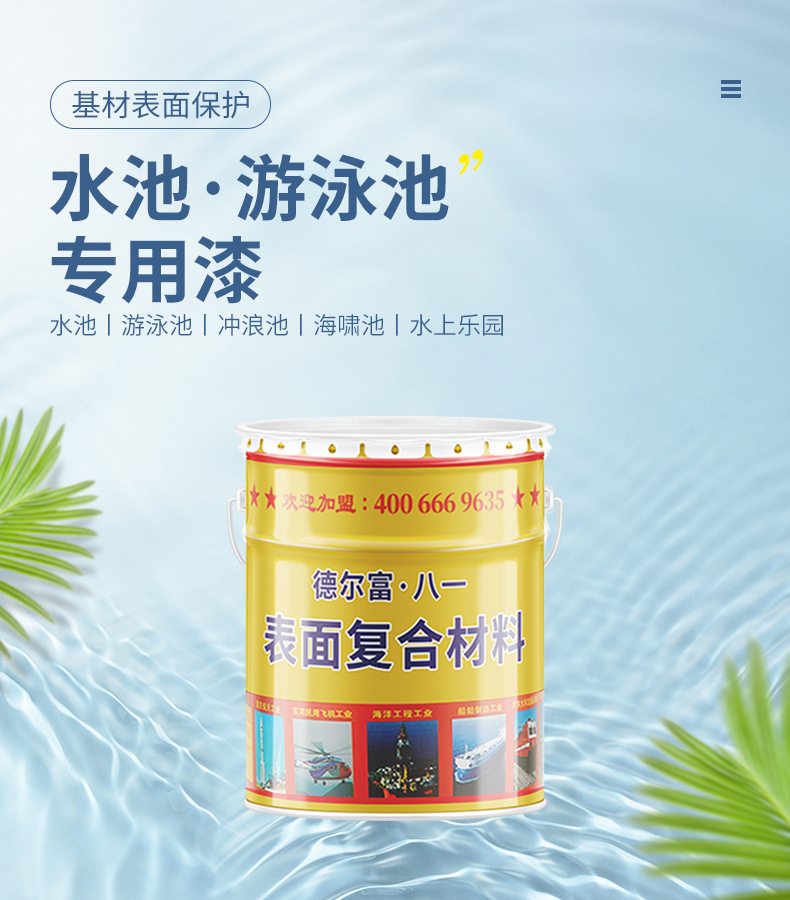 【德爾富】游泳池專用漆是一種專為水池、游泳池等長時(shí)間蓄水場(chǎng)景所研制的對(duì)環(huán)境友好型涂料,主要用于混泥土制及鐵制的游泳池,蓄水池(非飲用水)的涂裝,具有可通過標(biāo)準(zhǔn)化檢測(cè)的防滲水、防腐蝕、風(fēng)化、耐水浸泡、耐干濕交替、防止藻類生長等性能。