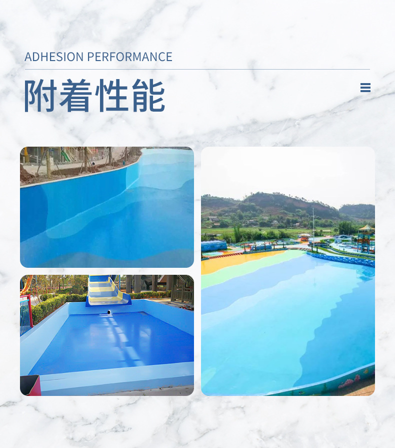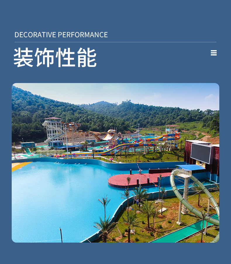 主要適用于多種場(chǎng)景下的水池、游泳池、水上樂園、沖浪池等需要蓄水的底部及四周表面裝飾保護(hù)用,容易修補(bǔ),可以用來替代傳統(tǒng)的瓷片。